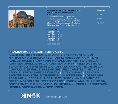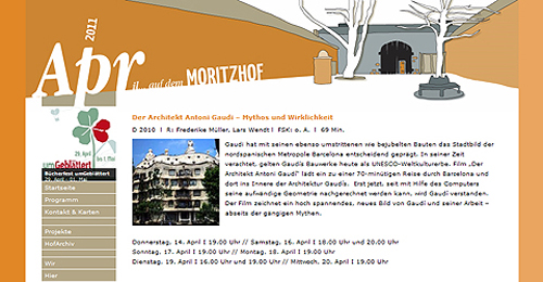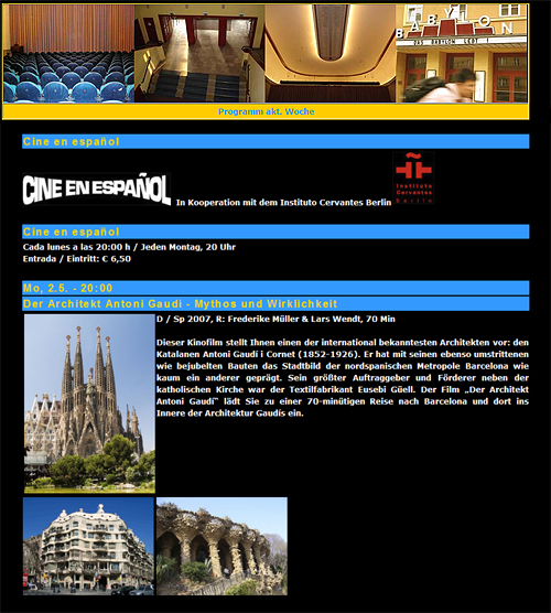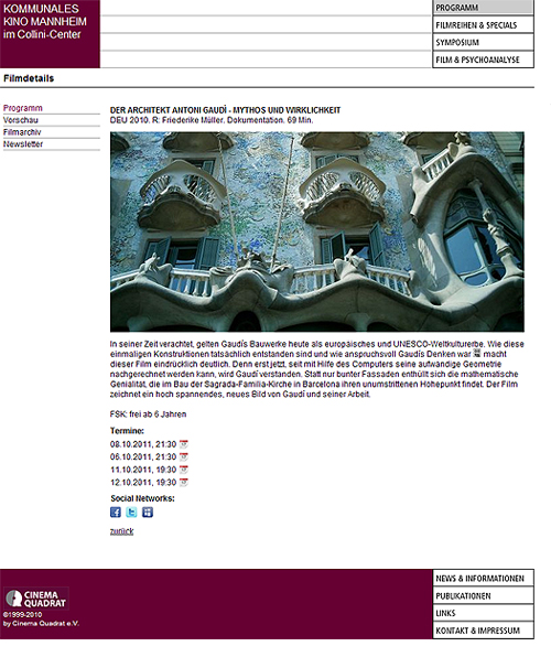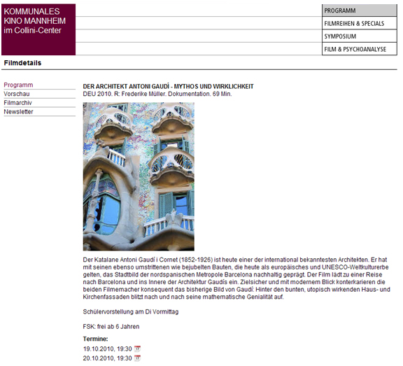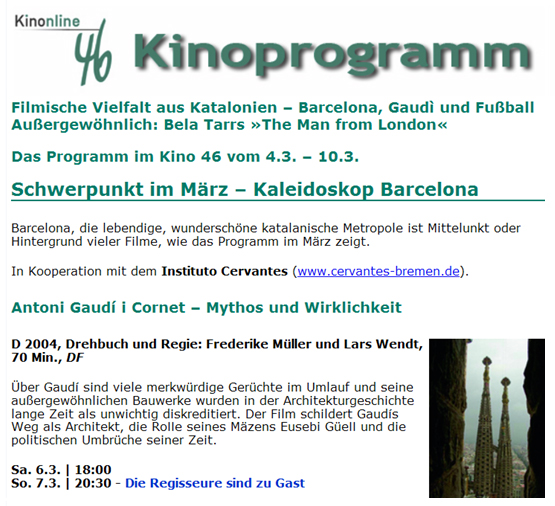 Der Film "DER ARCHITEKT ANTONI GAUDÍ - Mythos und Wirklichkeit" lief vier Tage als Programmhöhepunkt der 2. Dresdner Architekturfilmtage (28.05.-25.06.08) im Metropolis-Kino. Dabei zählten die Vorführungen zu den meistbesuchten der ganzen Veranstaltung. Das Echo auf den Film war unter Laien und Fachleuten einhellig große Zufriedenheit. Am Montag, 23.06.08, wurde im Anschluß an die Vorführung die Möglichkeit zum Gespräch mit dem Gaudí-Spezialisten Prof. Dr.-Ing. Jos Tomlow eifrig genutzt.